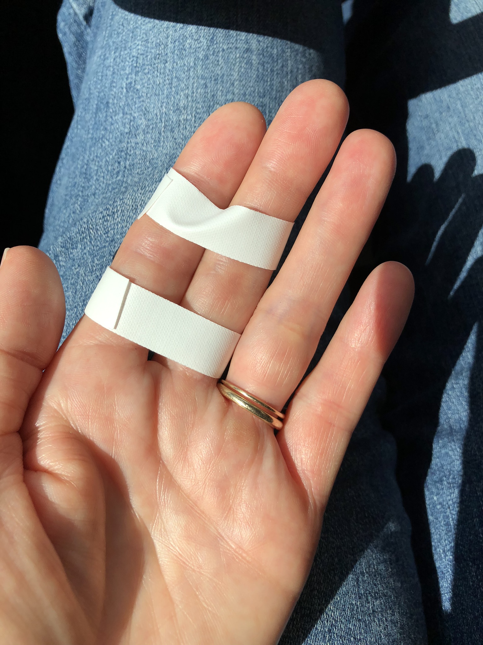 I’ve had jammed fingers before, so I put ice on it throughout the day and waited for the swelling to go down. In the next few days I kept waiting for it to go back to normal and the bruising to fade. After a few weeks, I finally went and got it checked out. Much to my surprise, it was broken! Thankfully, it was aligned properly and healing. The physician’s assistant instructed me to buddy tape it.