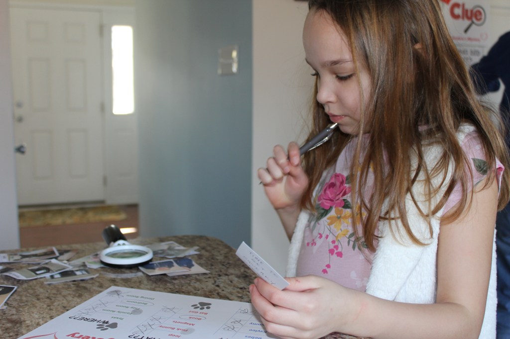 The mystery was solved. The two detectives had searched out each clue and followed through, eliminating suspects, items, and rooms as they went along. Our younger granddaughter, Adina, is only three years old, so she took many detours along the way. She stopped to play now and then and got distracted at times. Our 7-year-old granddaughter, Senna, however, was on a mission. She was completely focused and enjoyed figuring things out every step of the way.