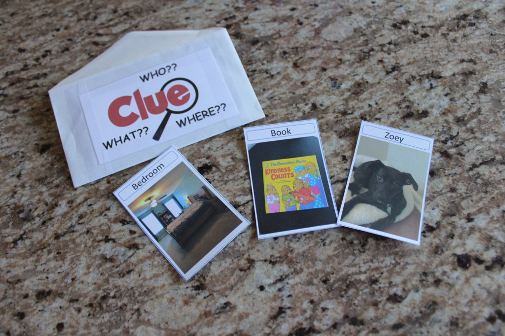 The mystery to be solved was who had taken what and hidden it where. We had suspects, items, and rooms – 5 of each. We created a list all the suspects, items, and rooms. We took pictures of each possible suspect, item, and room, but you could easily just write their names on an index card or paper. Next, we thought of locations to hide each of these clues. It was like a scavenger hunt, with each clue leading to the next one. We wrote the clues on the backs of the pictures. I hope this is making sense! Please write and ask me questions if it doesn’t!