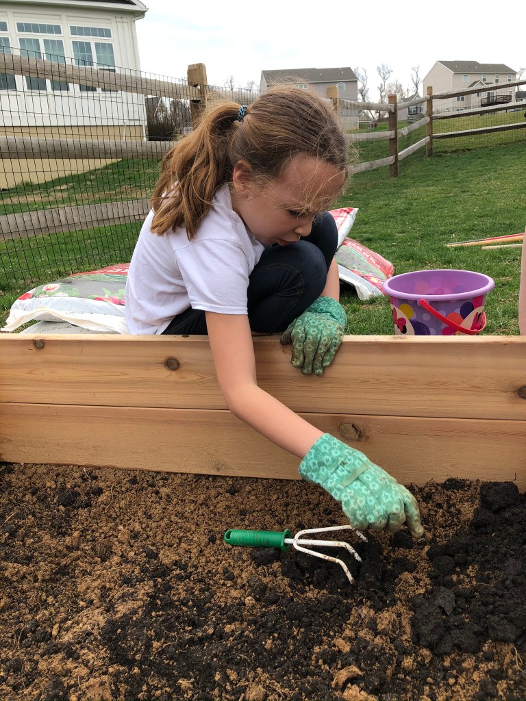 The dirt was flying! Some was landing back in the garden, some landed in Senna, her sister’s hair, some landed outside the box. Adina (my almost 4-year-old granddaughter) was having a blast playing/working in our box garden. She helped dig out rocks and get the soil ready. I love her enthusiasm in everything!